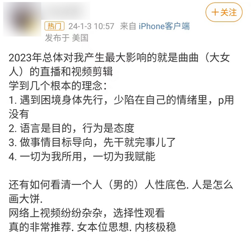 表面上,曲曲是一个打着“情感咨询”旗号,传授“大女人”智慧的情感博主,她主张女性应该独立自爱,要学会“利用”男性,而非“依赖”男性。