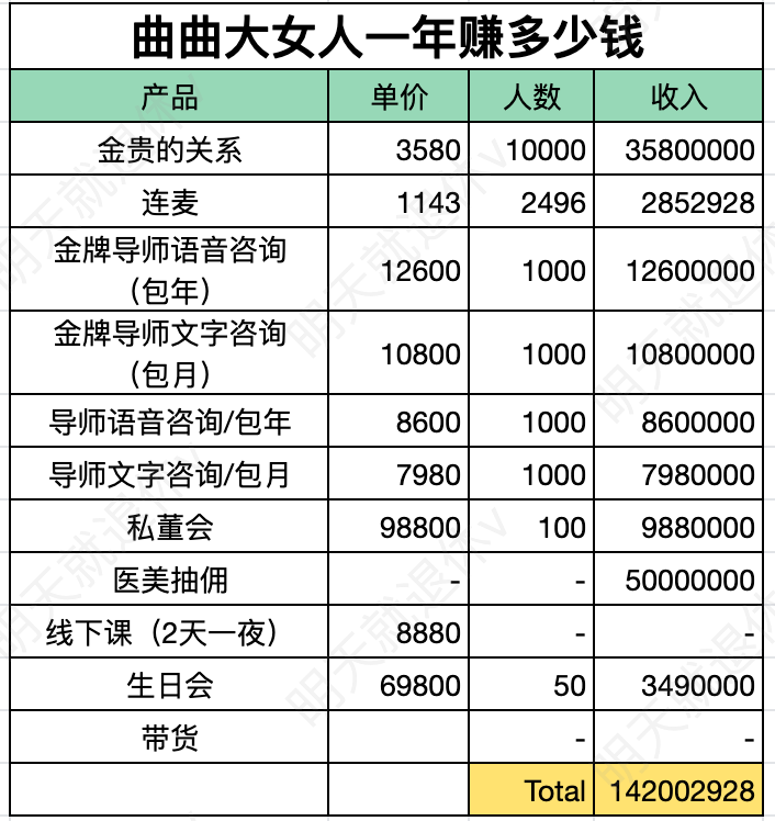 据博主@明天就退休V 保守统计,曲曲一年就赚了超过1.42亿元。