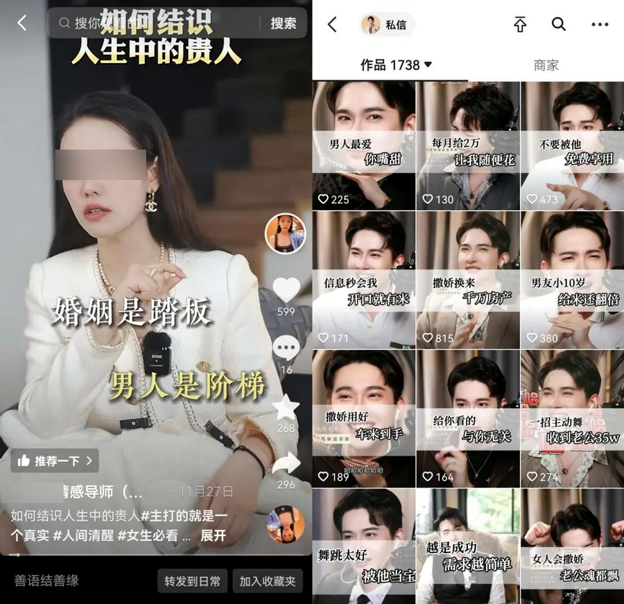 另一位拥有百万粉丝男性博主,则向女性传授了大量“如何通过撒娇等方式从男性身上获取金钱”的技巧。