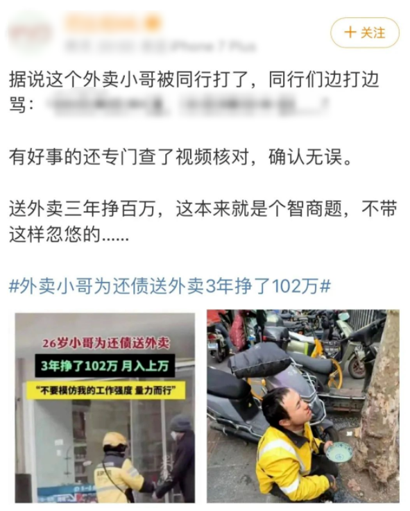 “最新情况!跑外卖3年赚102万的那个小哥被其他外卖小哥打了!”