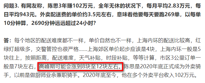 大风新闻|《上海一外卖小哥3年赚102万?业内知情者称基本属实,“单王”陈思方面回应网络传言及质疑》