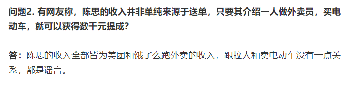 其中传得最“绘声绘色”的一条是:“陈思之所以能赚那么多钱,主要不是靠送外卖,而是靠拉新人买电瓶车去跑外卖赚钱。”
