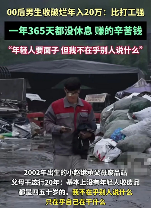 其实就在昨天,还有一个类似的新闻也上了热搜,那就是“00后男生收破烂年入20万”。