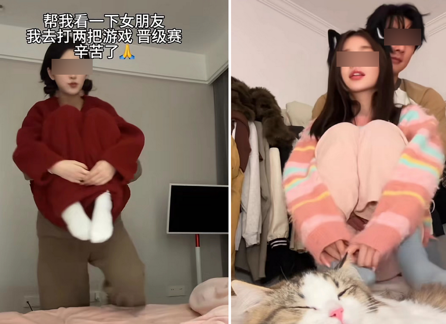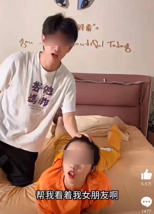 这类视频中,男生通常会抱起娇弱瘦小的女生,把她重重扔在床上,并嘱托网友帮忙照看一下女朋友。
