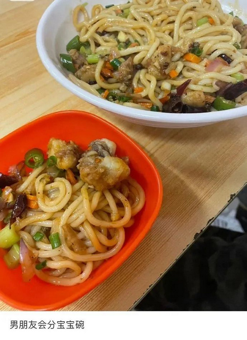 从男朋友的大碗里分出一点点食物,放在小碗里,就是所谓的“宝宝碗”。