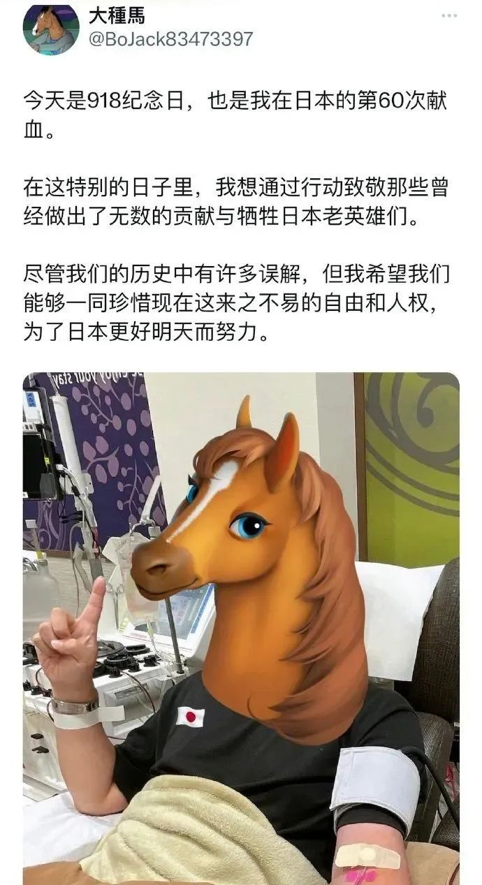 或是故意选择在九一八那天,在日本献血,并将侵华日军称为“英雄”。