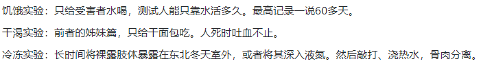 除此之外,还有饥饿实验、干渴实验、冷冻实验等常人难以想象的变态实验。