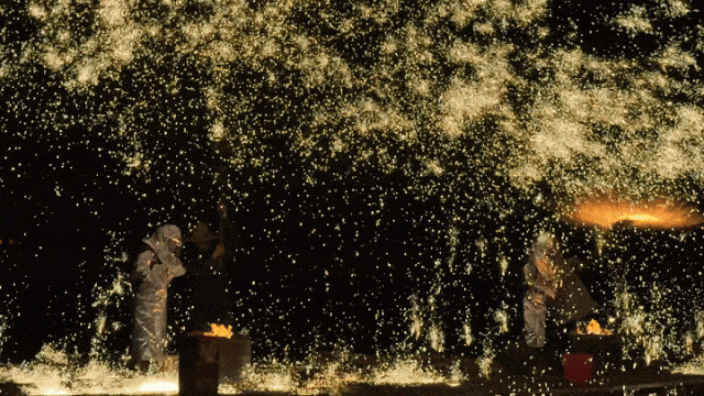 表演打铁花时,需要将1600℃的铁水打到高空中,火红的铁水簌簌落下,比烟花还要绚烂华丽。
