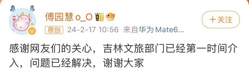 距离发文求助过去不到两个小时,傅园慧再次更新微博表示:“感谢网友们的关心,吉林文旅部门已经第一时间介入,问题已经解决。”