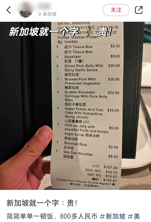 在新加坡随便吃顿简餐,800多块钱就没了。