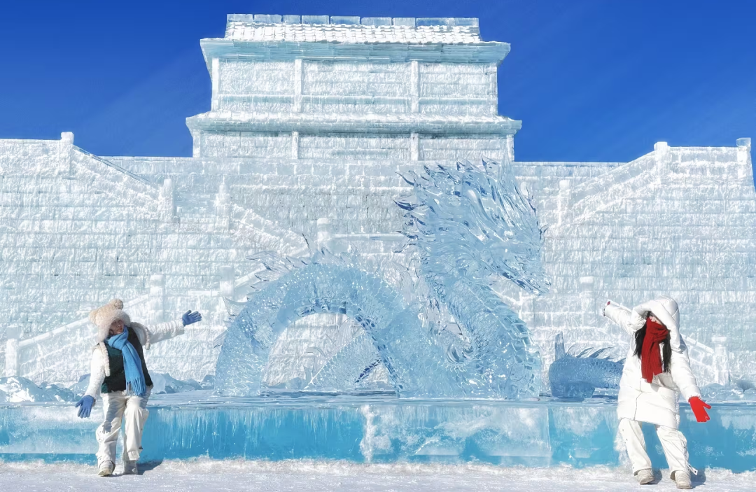 一位看上去“弱不禁风”的女孩,正站在刺骨的寒风中,挑战雕刻可能是目前世界上最大的自然冰单体冰雕龙,第二次。