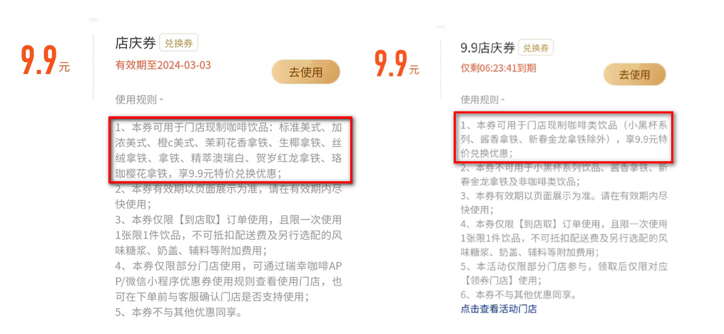 不少网友发现,瑞幸咖啡每周“9.9元喝一杯”优惠券活动范围变了,不再是全场饮品通用,而是只剩下8款指定饮品(现在变成了10款)参与活动。