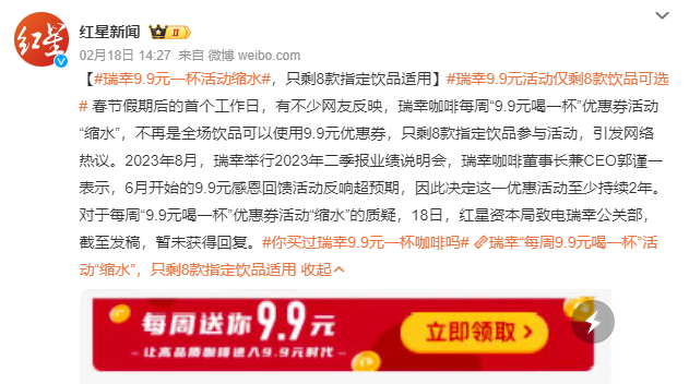 春节假期结束后,号称打工人“续命神器”的瑞幸咖啡,悄悄咪咪地将9.9元活动“缩了水”。