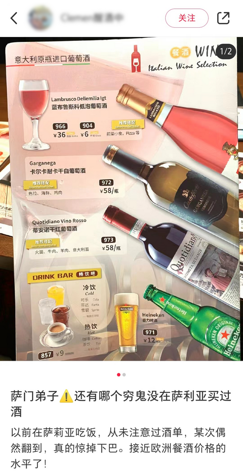 还有的人把萨莉亚当做喝酒的地方,6元一杯的低泡葡萄酒,比酒吧便宜多了。