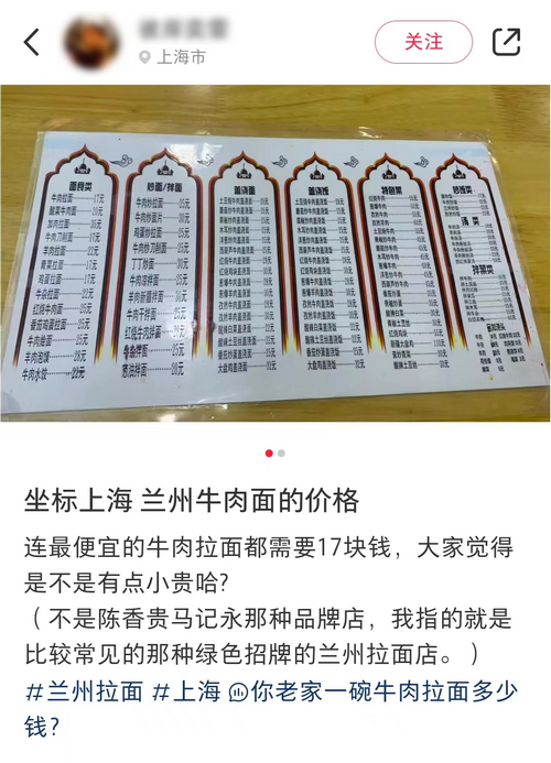就拿上海来说吧,兰州拉面店里最便宜的牛肉拉面都要17元一碗。