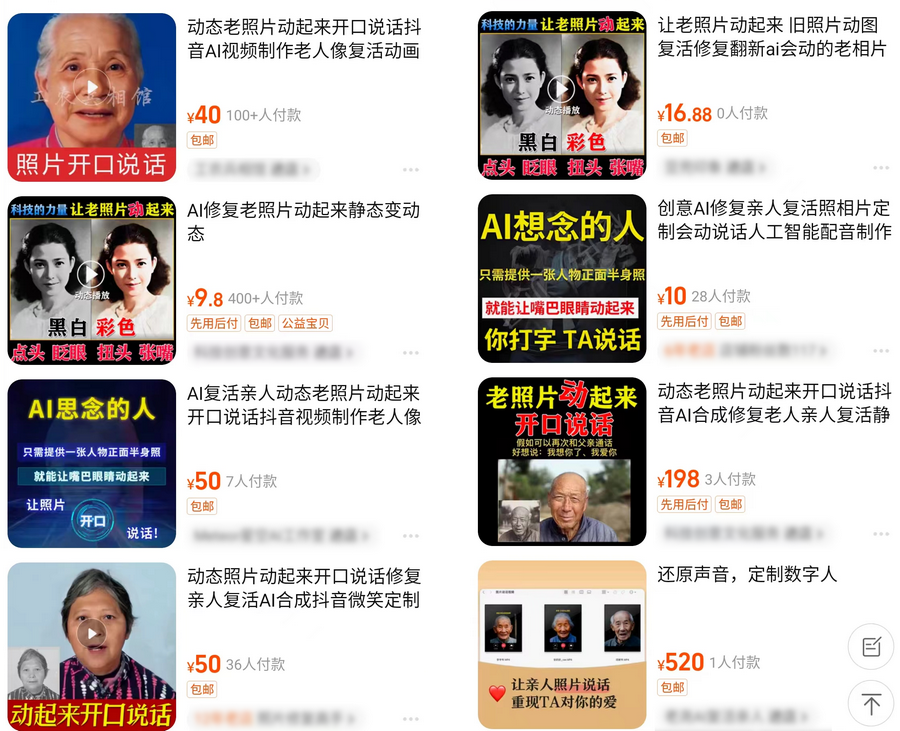 唐唐搜索某电商平台发现,很多商家都提供“AI复活亲人”的服务,最便宜的只要10元起。