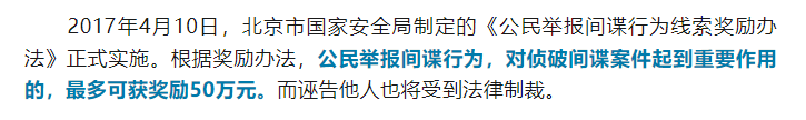 哦对了,你要是真发现了形迹可疑、疑似间谍的人,向国家安全机关举报,最高有可能拿到50万元的奖励呢!