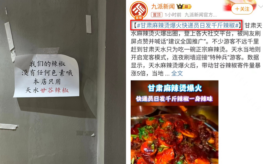 因此,甘肃麻辣烫火了之后,甘谷辣椒的销量也跟着暴涨,有媒体报道称,当地的快递员一天要发货上千斤甘谷辣椒。