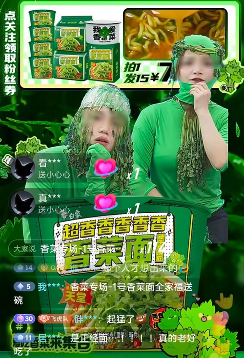 除了把布景搞得绿油油的,直播间的主播也是从上绿到下,甚至头上也顶着真香菜,真就是绿瞎了观众双眼。不少网友直接吐槽:主播你们这是把“香菜比基尼”穿身上了吗?