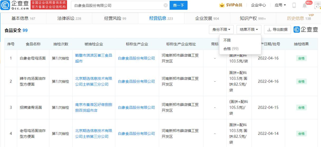 根据企查查的食品安全信息显示,白象方便面所有的抽检记录100%合格,这其中还包括白象对外投资的公司以及它的分公司被抽检的产品。