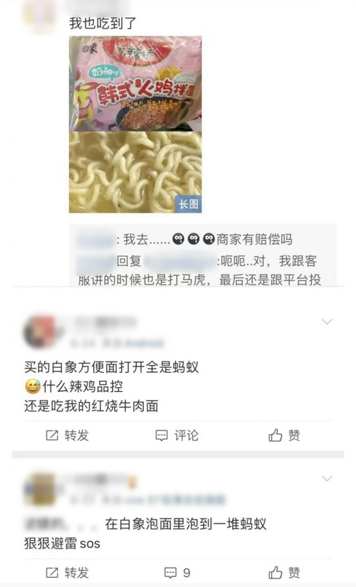 随后,更多的网友爆料,自己在白象方便面里吃到了蚂蚁。