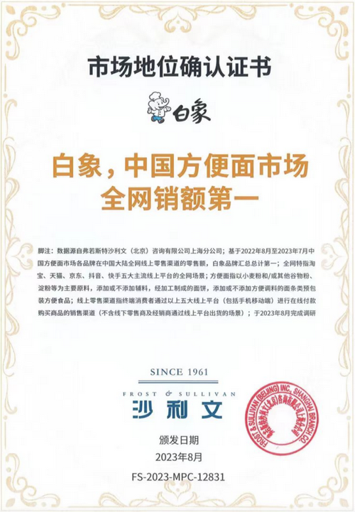 据沙利文数据显示,在2022年8月-2023年7月,白象在中国方便面市场全网销量第一。