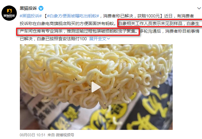 2022年8月左右,一条#白象方便面被曝面饼上满是蚂蚁#的消息,冲上了热搜。