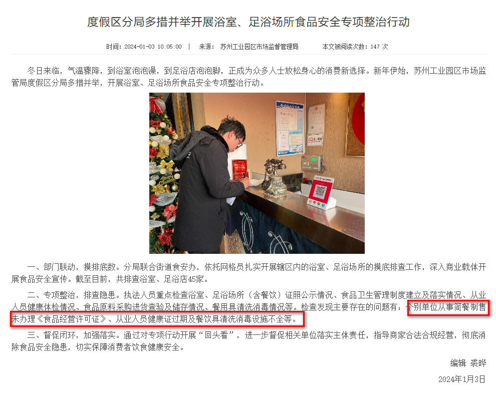 此前,苏州市场监管局曾在个别浴室、足浴场所查到“未办理《食品经营许可证》”“从业人员健康证过期”“餐饮具清洗消毒设施不全”等问题。