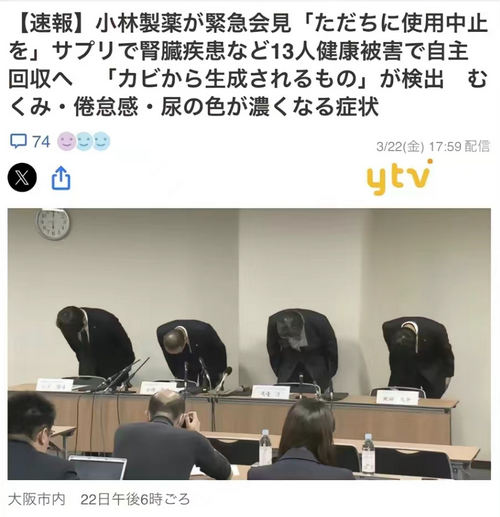 3月22日晚上,小林制药社长举行记者会,就这一事件鞠躬道歉。