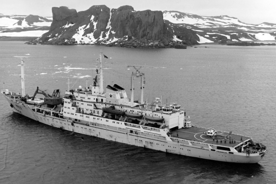 1984年12月26日,中国“向阳红10”号南极考察船在南极洲乔治岛民防湾。图|新华社