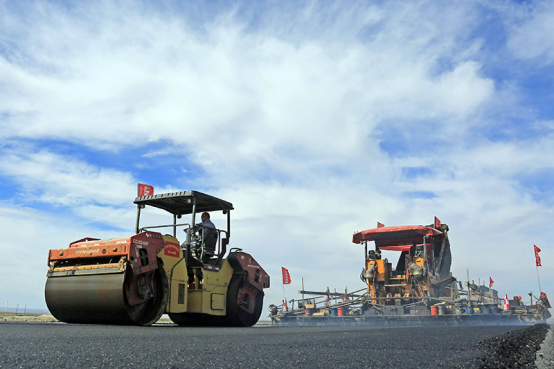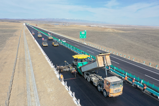 2021年4月28日,新疆巴里坤,铺路机械在京新高速公路上作业。图|IC photo