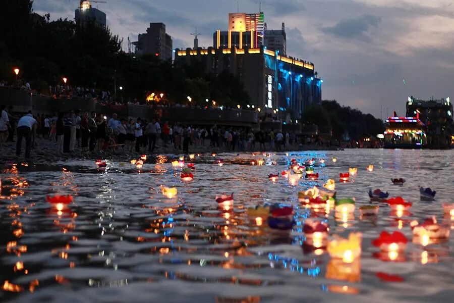 2015年8月26日,兰州解放纪念日,兰州市民在黄河边投放河灯。图|视觉中国