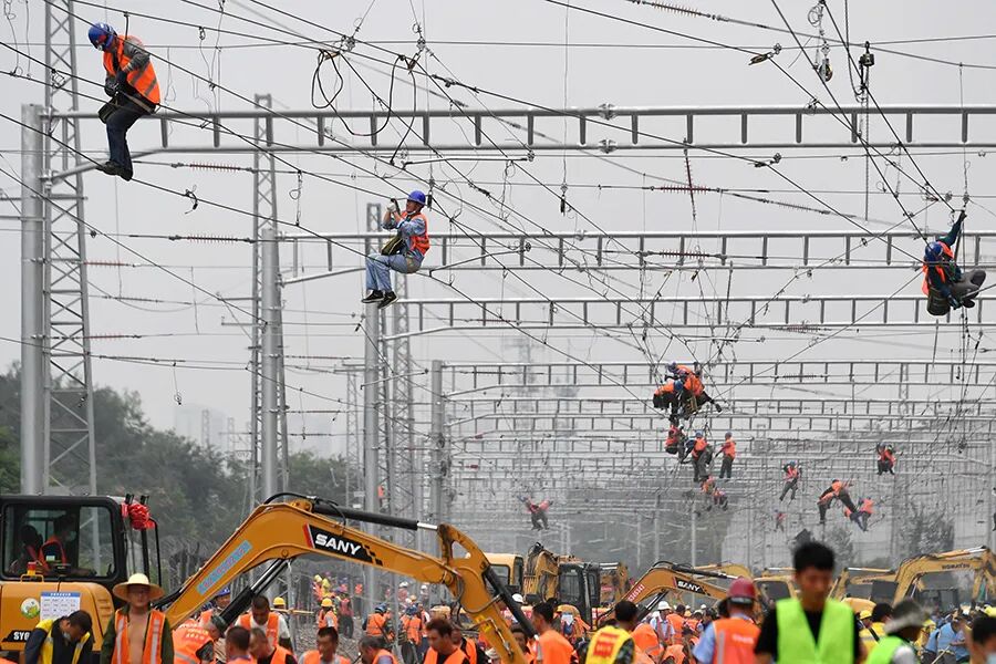 2020年8月30日,中铁六局的施工人员在北京丰台站进行拨线作业。图|新华社