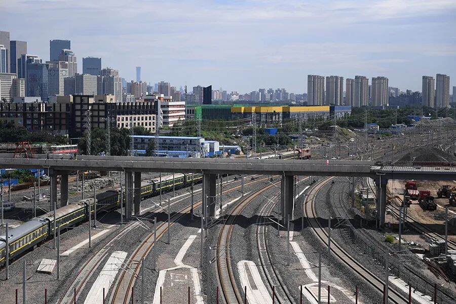 2021年8月25日,一列火车经过建设中的北京丰台站。图|新华社