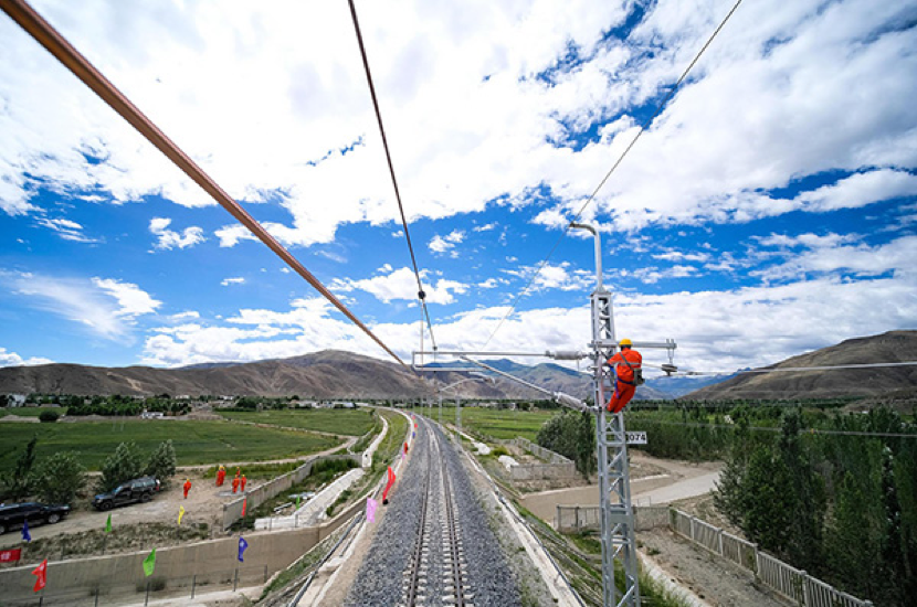 2020年7月6日,中国中铁电气化局施工人员对川藏铁路拉萨至林芝段接触网专业首件工程进行复检。图|中新社