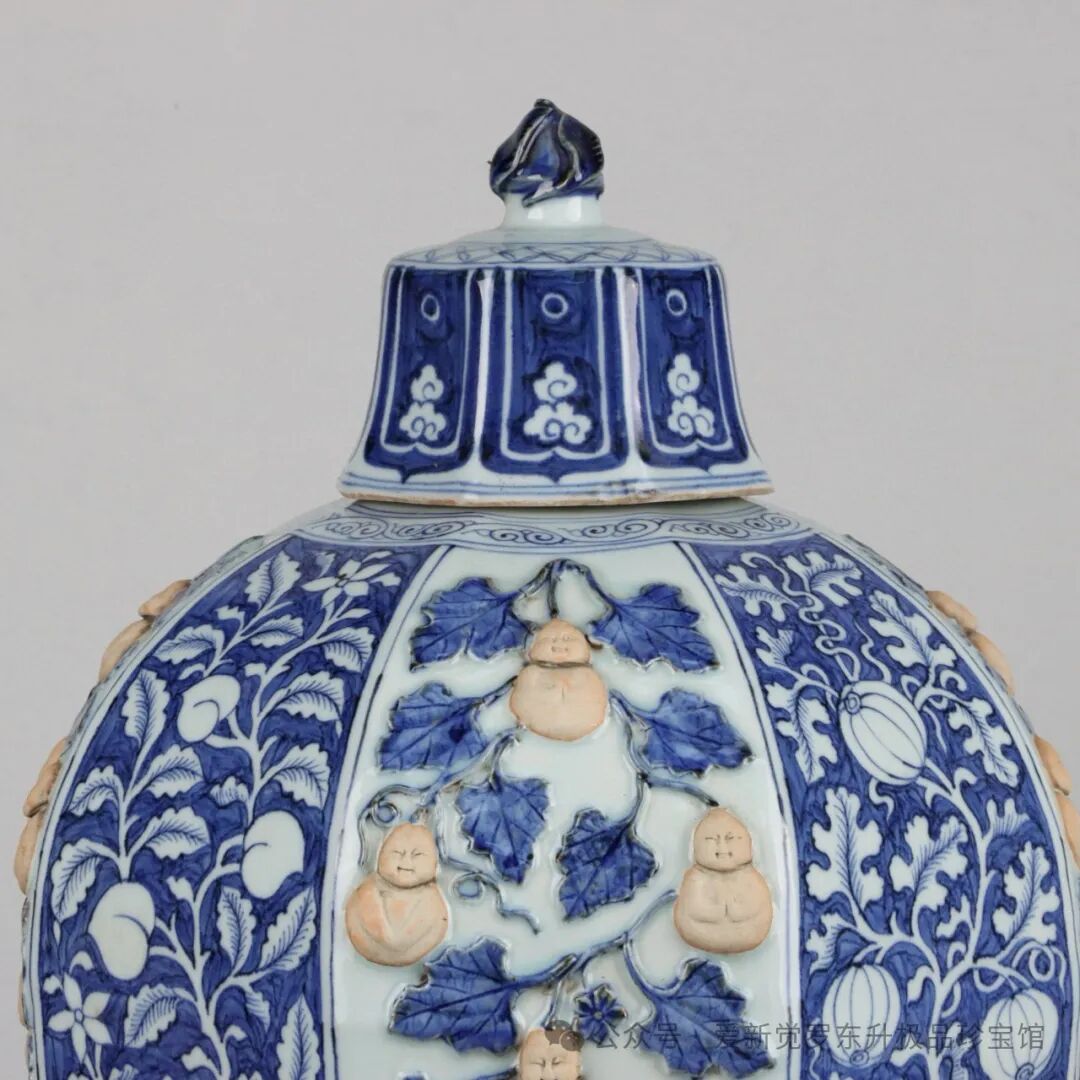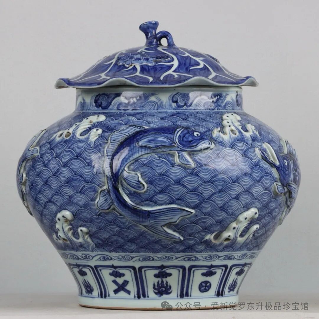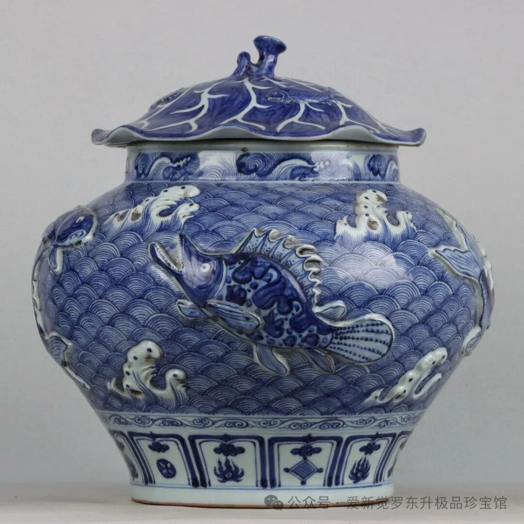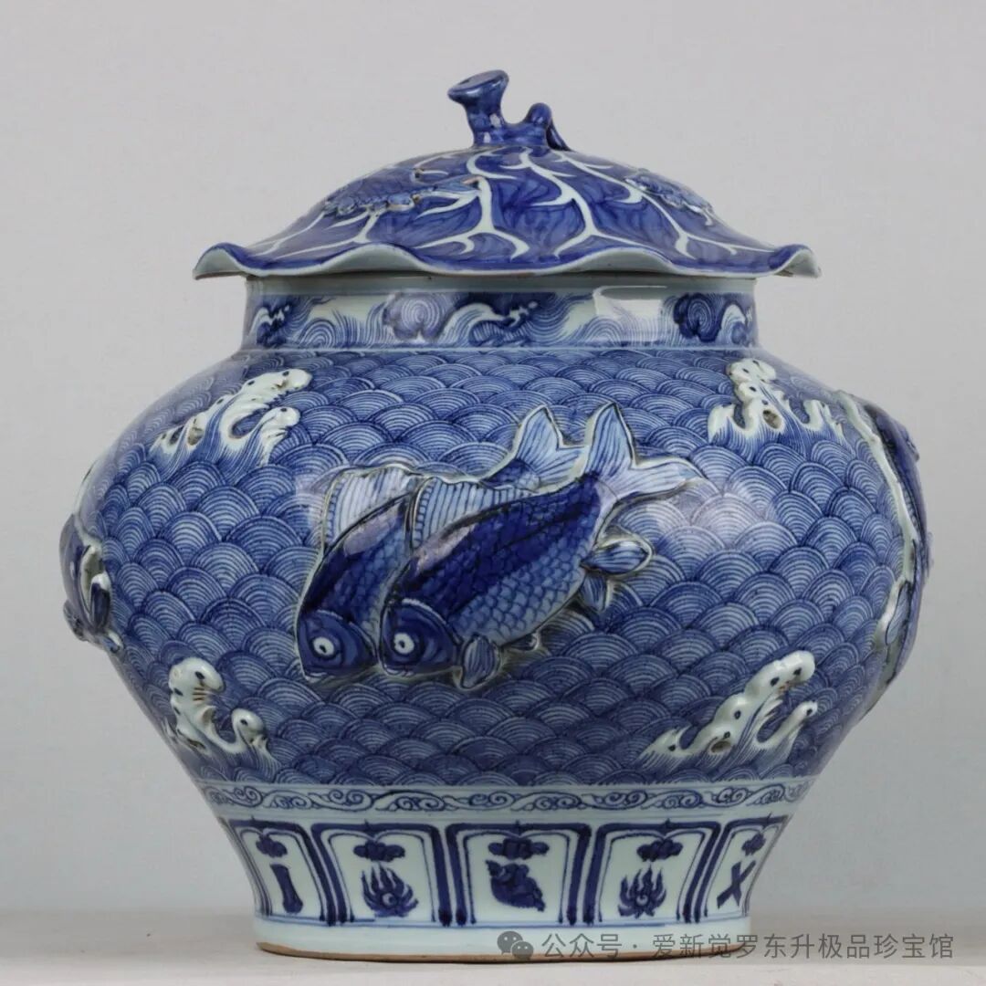 元代:青花浮雕鱼藻纹荷叶罐高宽:37*34cm
