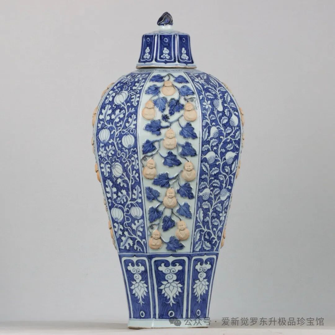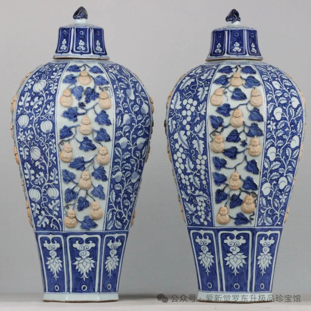 元代青花釉里红浮雕葫芦纹八方梅瓶一对高55cm宽25cm