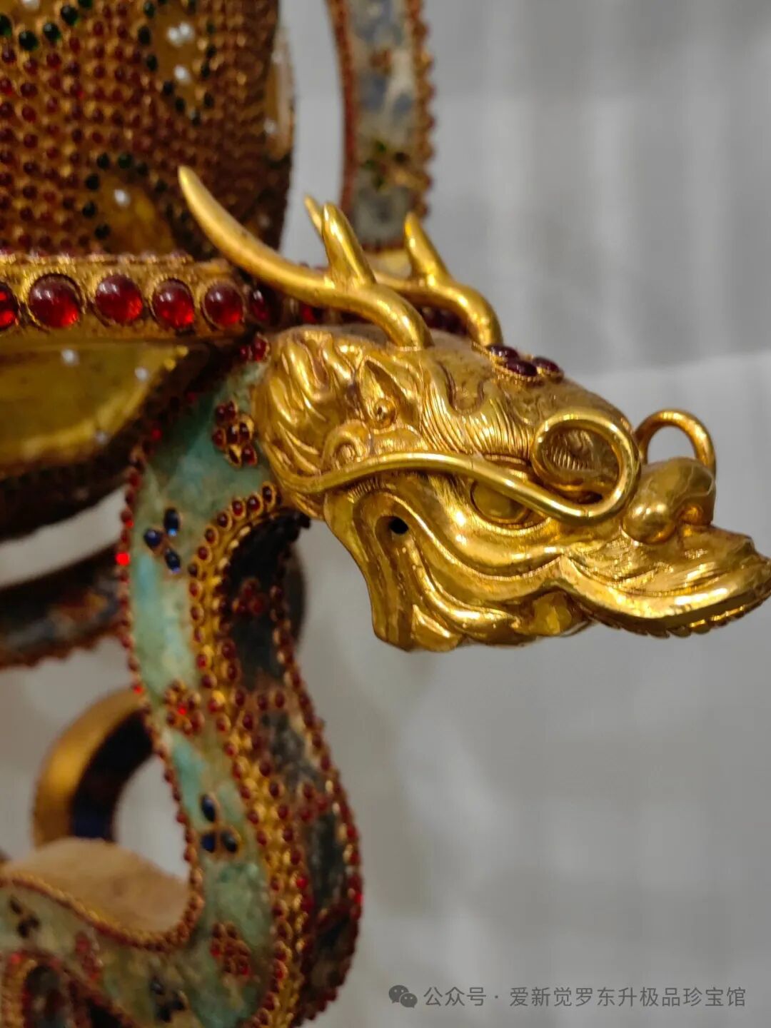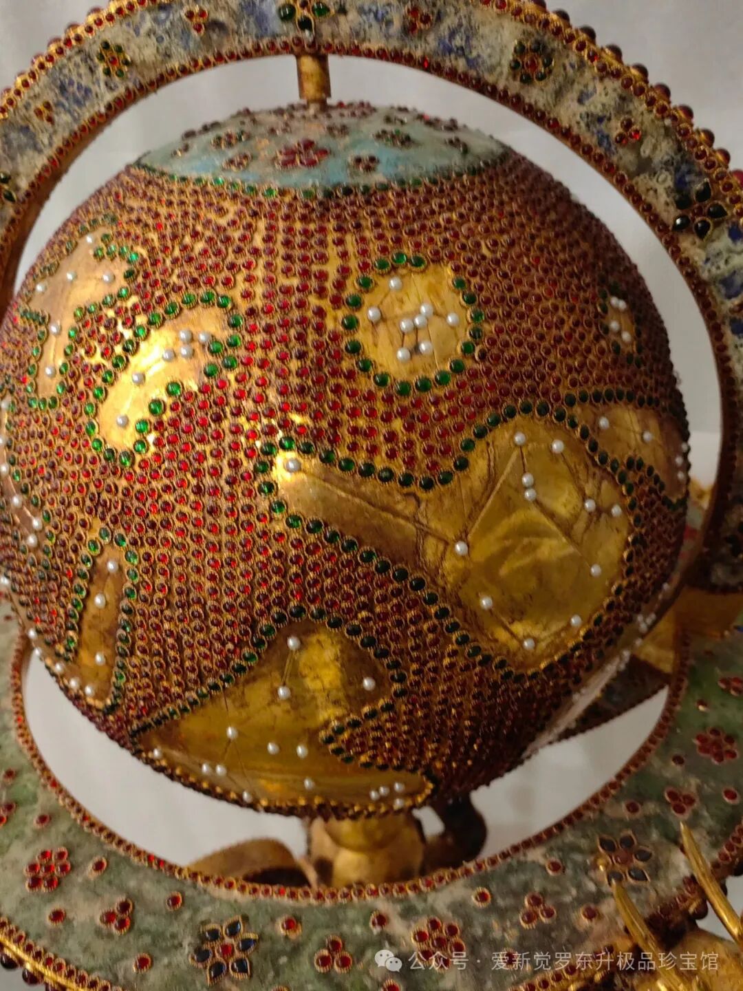 一、工艺之精湛:铜鎏金与红宝石的完美结合铜鎏金,这种古老的金属工艺,以其独特的金色光泽和坚固耐用的特性,历来深受皇家喜爱。而在这件地球仪上,铜鎏金更是被发挥到了极致,每一道纹路都清晰可见,每一处细节都经过精心打磨,彰显出无与伦比的工艺之美。