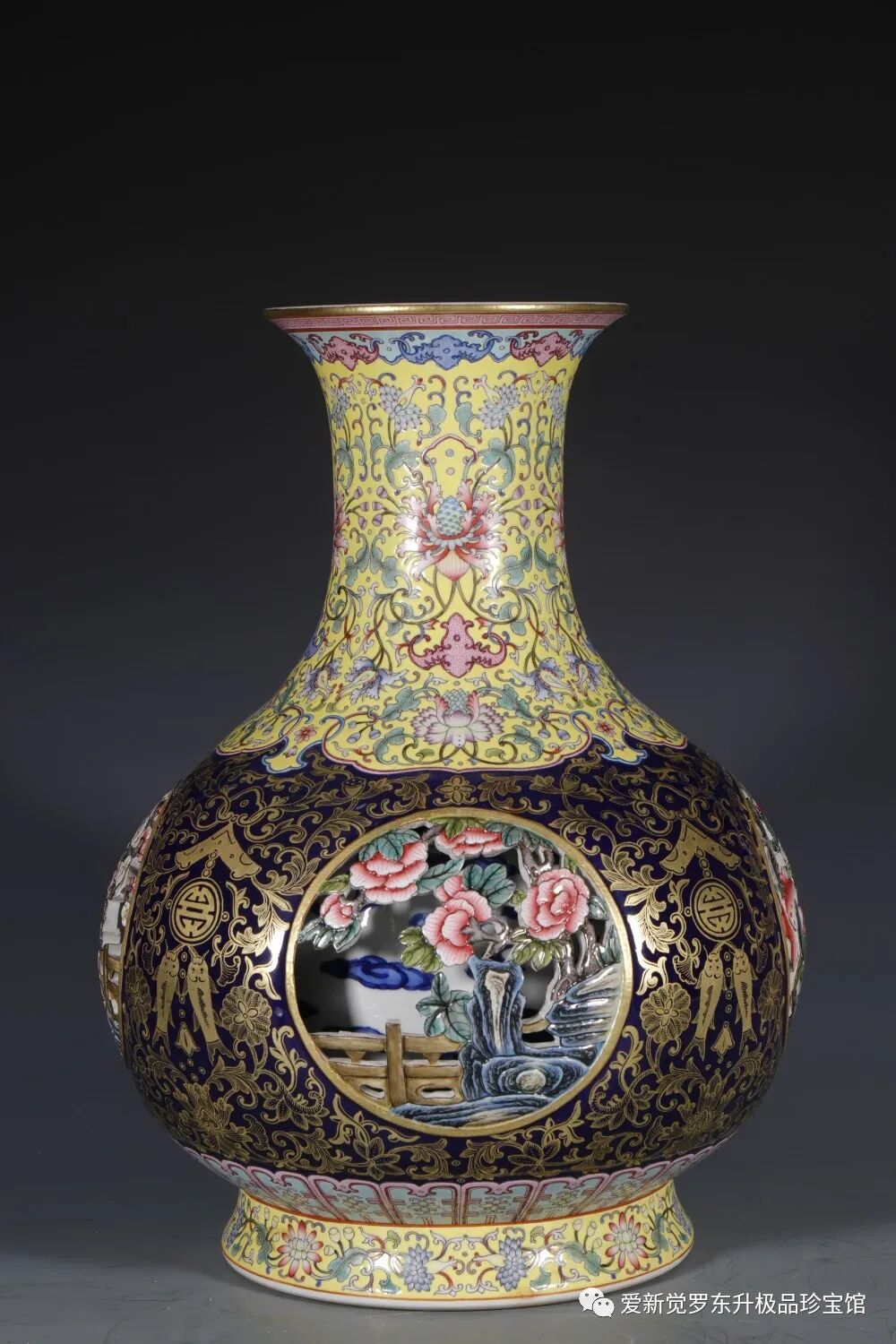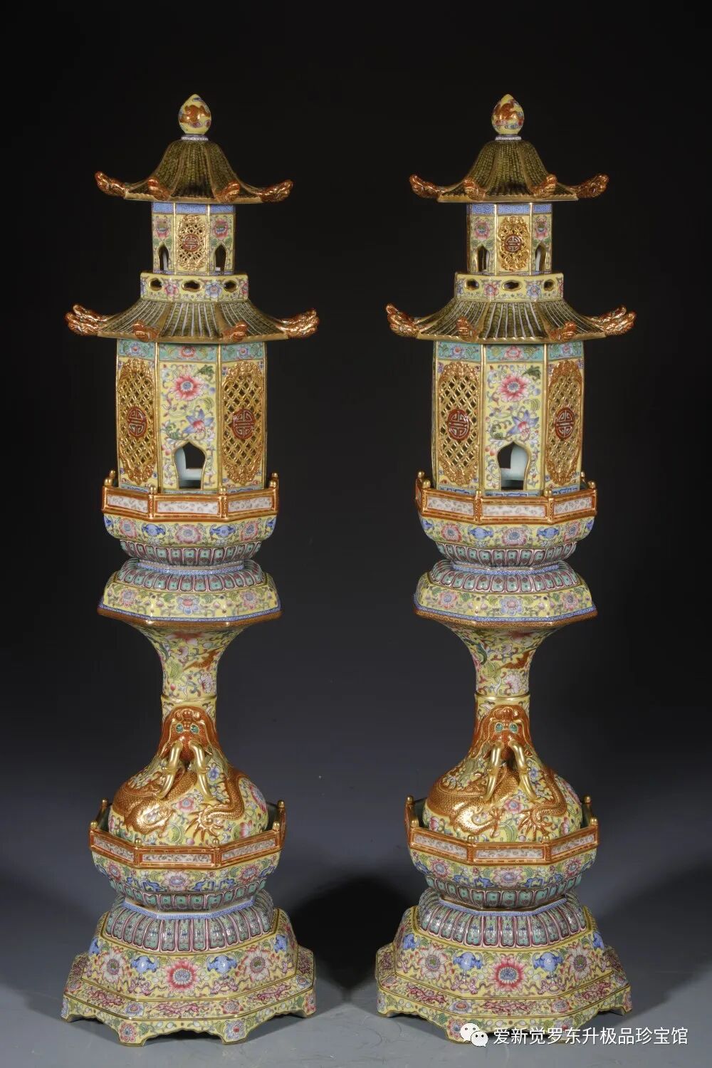 二、乾隆御制镂空瓷器的特点乾隆御制镂空瓷器具有以下几个特点:1. 工艺精湛:乾隆时期的镂空瓷器工艺精湛,雕刻精细入微,线条流畅自然,给人以强烈的视觉冲击力。2. 造型别致:乾隆御制镂空瓷器的造型别致,形态各异,有花瓶、盘、碗、笔筒等多种样式,其中以花瓶最为常见。3. 图案精美:乾隆御制镂空瓷器的图案精美,有山水、花鸟、人物等多种题材,其中以山水题材最为常见。4. 寓意深远:乾隆御制镂空瓷器的寓意深远,反映了当时社会的文化、思想、信仰等方面的特点。清乾隆:珐瑯彩镂空重器描金宫灯高60厘米 底径18厘米