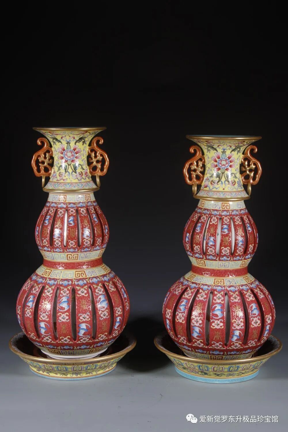 清乾隆:胭脂红釉爬花福寿延年纹雕刻镂空转心葫芦瓶高40厘米 口径19厘米 底径21厘米