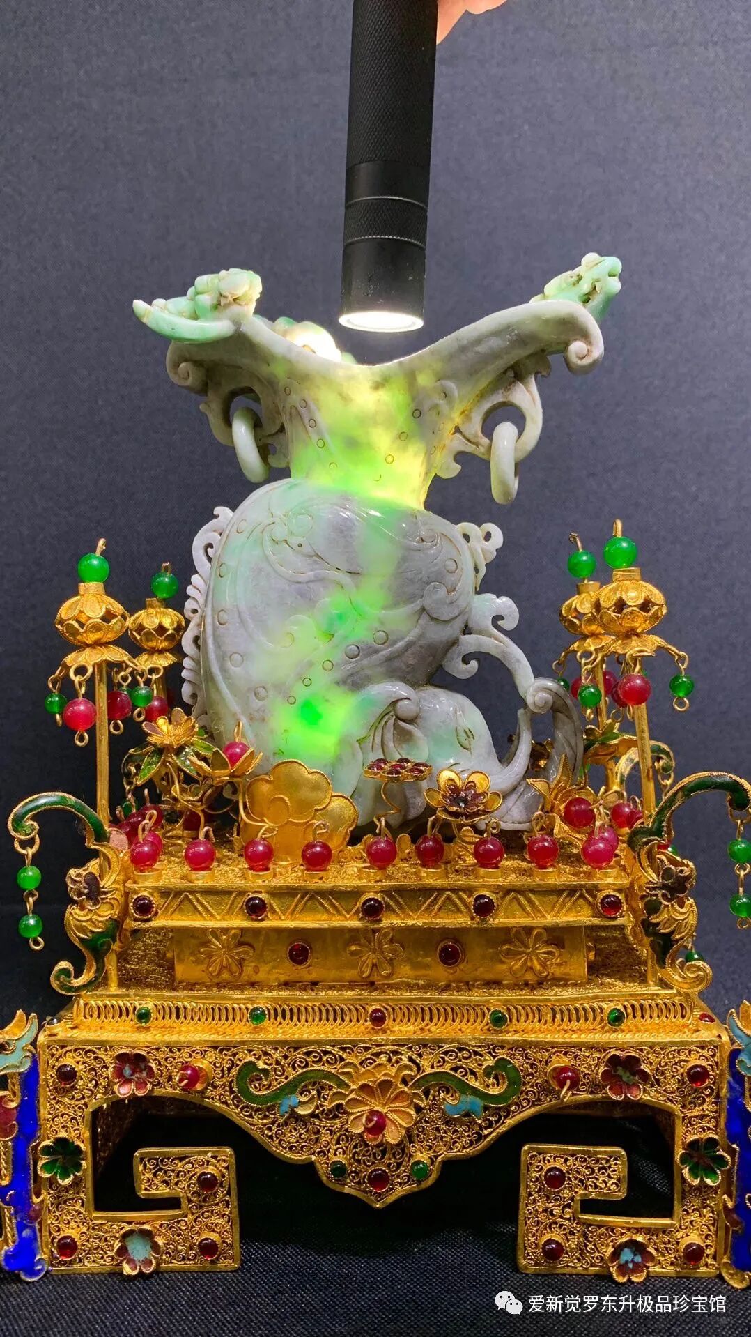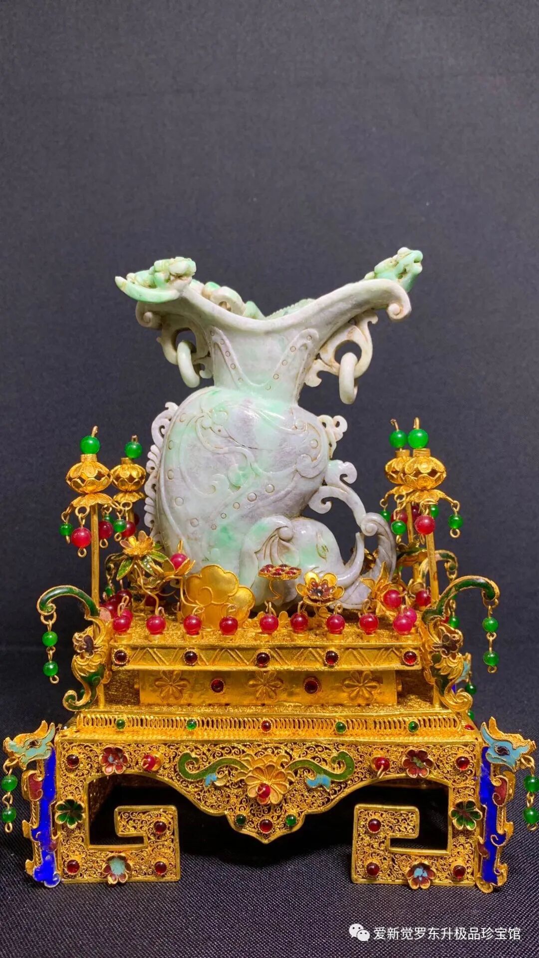鎏金累丝镶嵌翡翠【象角杯】翡翠可国检高26cm 宽23cm总重3.8斤翡翠重2斤