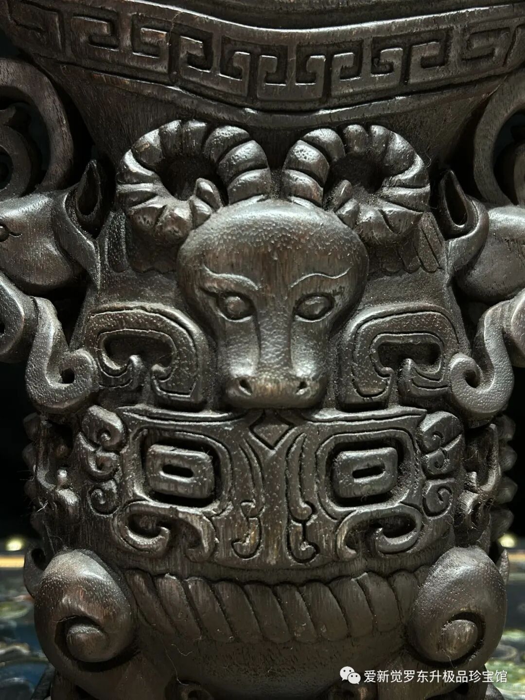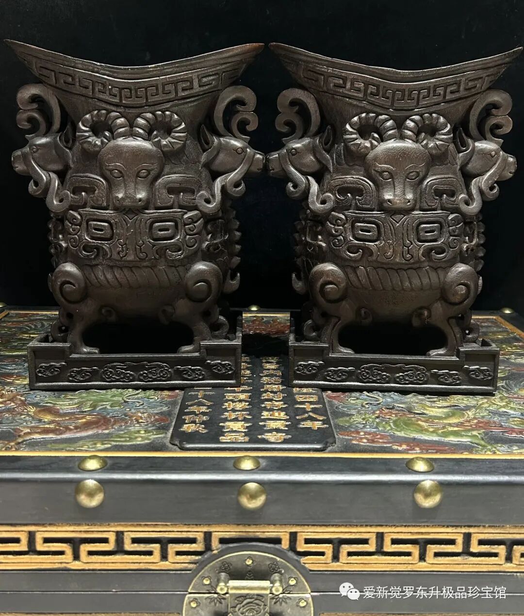清代 老沉香 奇楠 《双耳牛头樽杯》一对摆件 高:27cm宽:20cm 厚:9cm 重:839.3克 、785.1克 寓意:健康长寿、财源广进。天然老沉香大料整雕,雕工清晰,极具神韵,刀工精湛,味道极好,木质细腻、皮壳包浆一流,收藏绝品