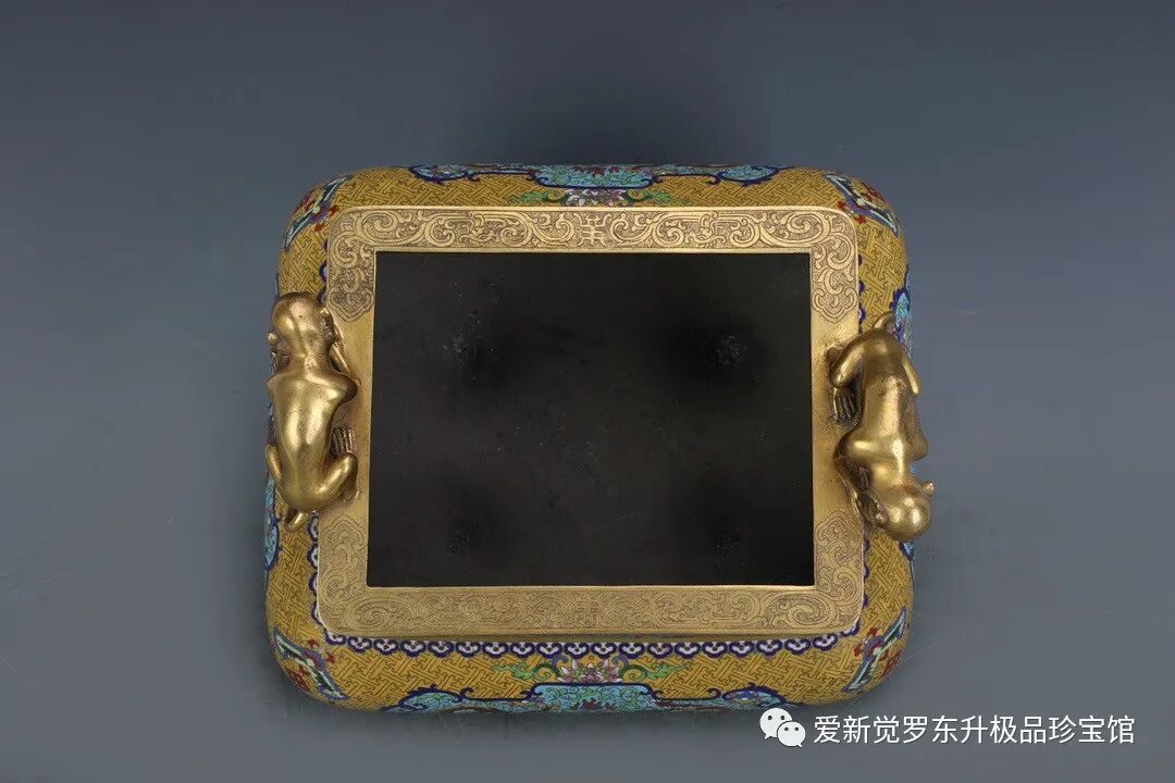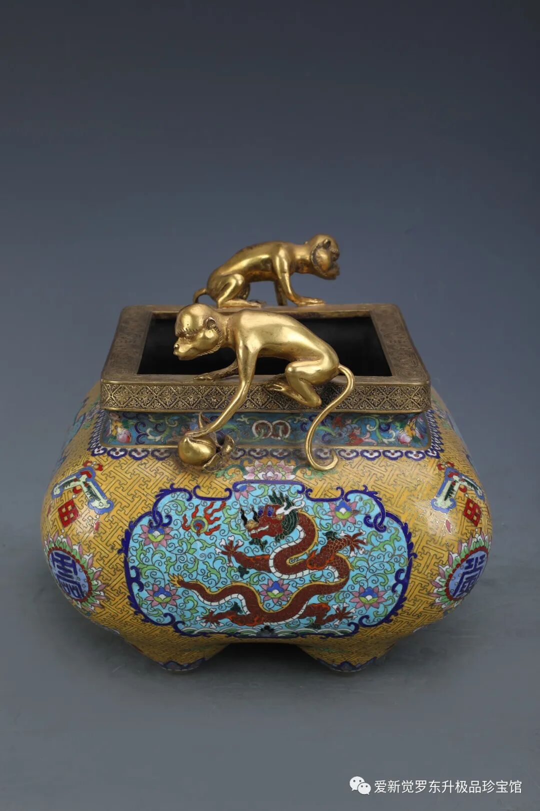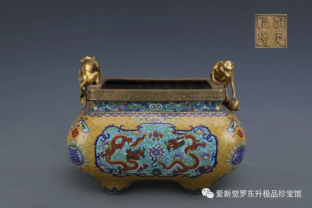 原创作者:爱新觉罗东升首先我和大家讲一讲 :在历史的长河中,收藏市场一直以其独特的魅力和无限的可能性吸引着无数热衷于此的人们。进入2024年,我们见证了收藏市场的重新洗牌,这一变革不仅重塑了市场的格局,更为收藏家和投资者带来了前所未有的机遇与挑战。清 精铸铜胎景泰蓝掐丝珐琅洞天福地炉【规格】高25cm 口径24*19.5cm 腹径32*25.5cm 重11.1公斤【铭款】洞天福地【详述】 铜胎,质地厚实,造型规整,局部鎏金,金水肥厚饱满。四方形制,侈口,束颈,溜肩,弧腹,腹部丰硕,下部渐收,底承四乳足,端庄优雅。口部内外錾刻精美夔龙捧寿纹、团花纹饰;口沿两侧置双猴子摘桃为耳,身躯蜷曲,一手支口沿,一手作摘桃状,形象逼真,栩栩如生。整器满工掐丝,以黄色“卍”字纹锦地,腹部四面开窗,精作双龙戏珠纹、云龙纹饰,饰以缠枝莲纹、如意云头纹点缀。底部阴铸篆体落款「洞天福地」,字体明朗俊逸,舒展大气。整器色泽鲜艳,雍容华贵,掐丝工艺精湛,繁而不乱,一丝不苟,形制典雅,寓意吉祥美好,炉之四角圆润饱满,气度不凡,置于案头几旁,顿生几分古意。