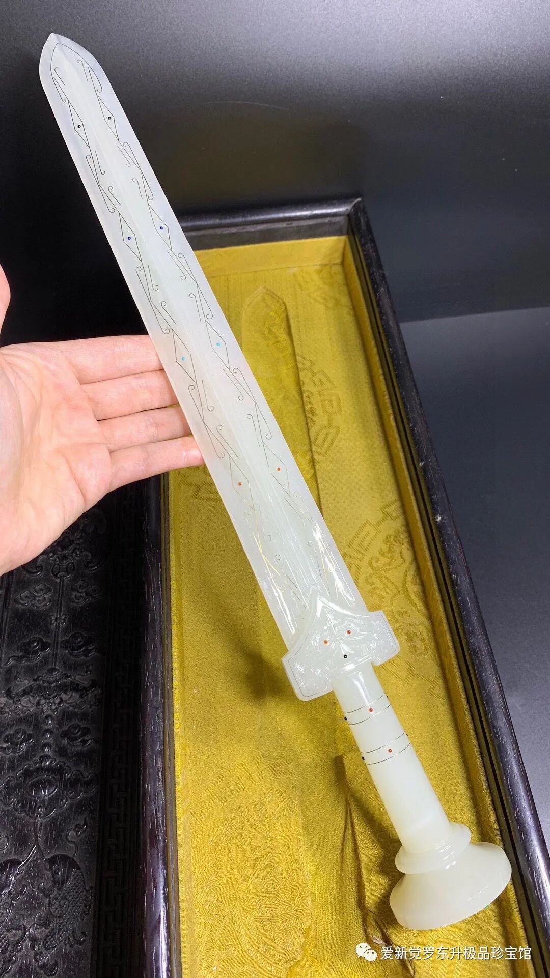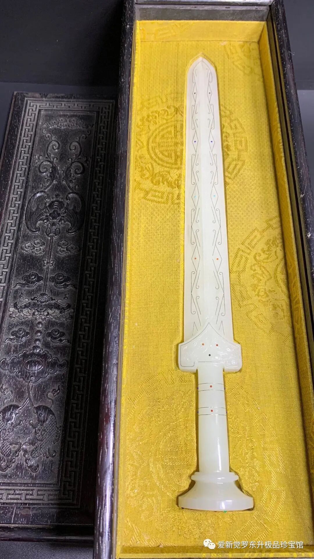 整体和田白玉嵌金银丝【宝剑】可鉴定 一级白玉剑长43cm 宽5cm盒子长50cm 宽16cm