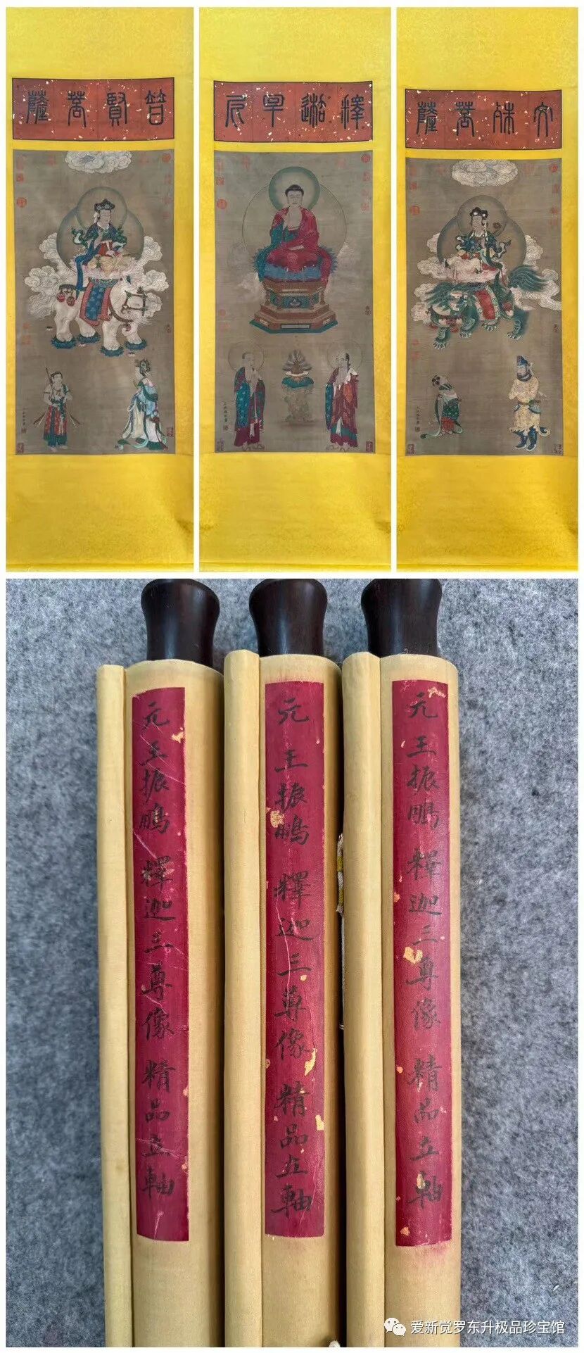 旧藏. 元代. 王振鹏.精品绢本(释迦三尊像).画心加祠堂尺寸:51.5cmX120cm*3幅