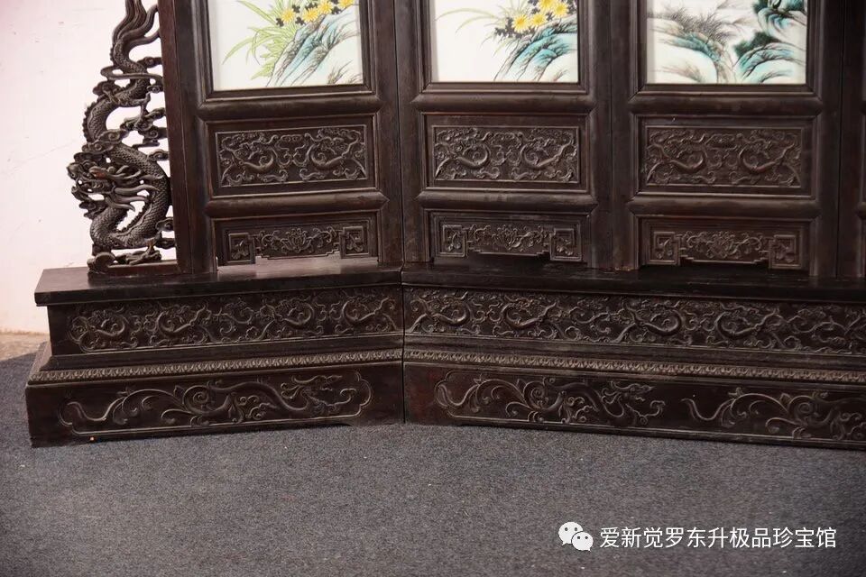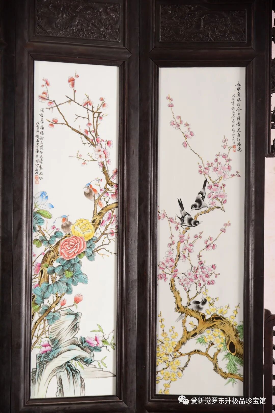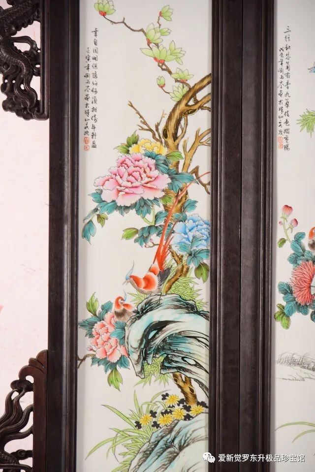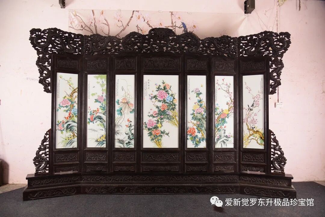 珠山八友之刘雨岑作品赏析!!!红木雕龙头七扇屏风镶粉彩花鸟瓷板《富贵满堂》七扇大座屏!尺寸高240宽380