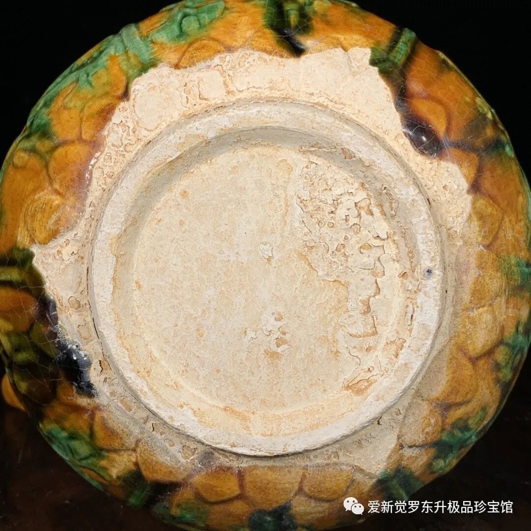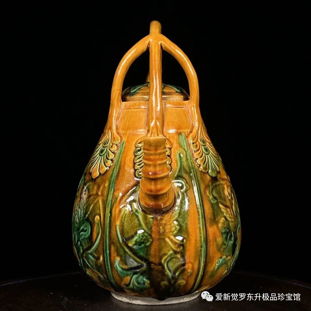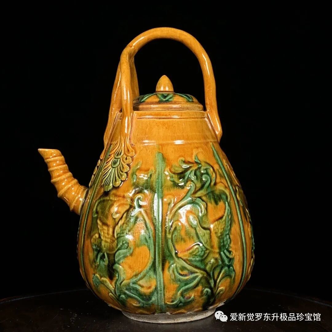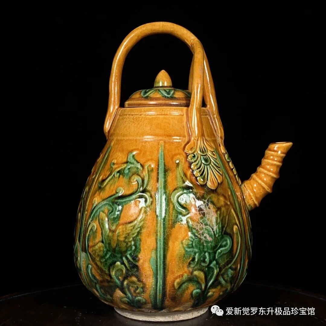 唐三彩花鸟纹竹节提梁壶,高23.5直径16cm,