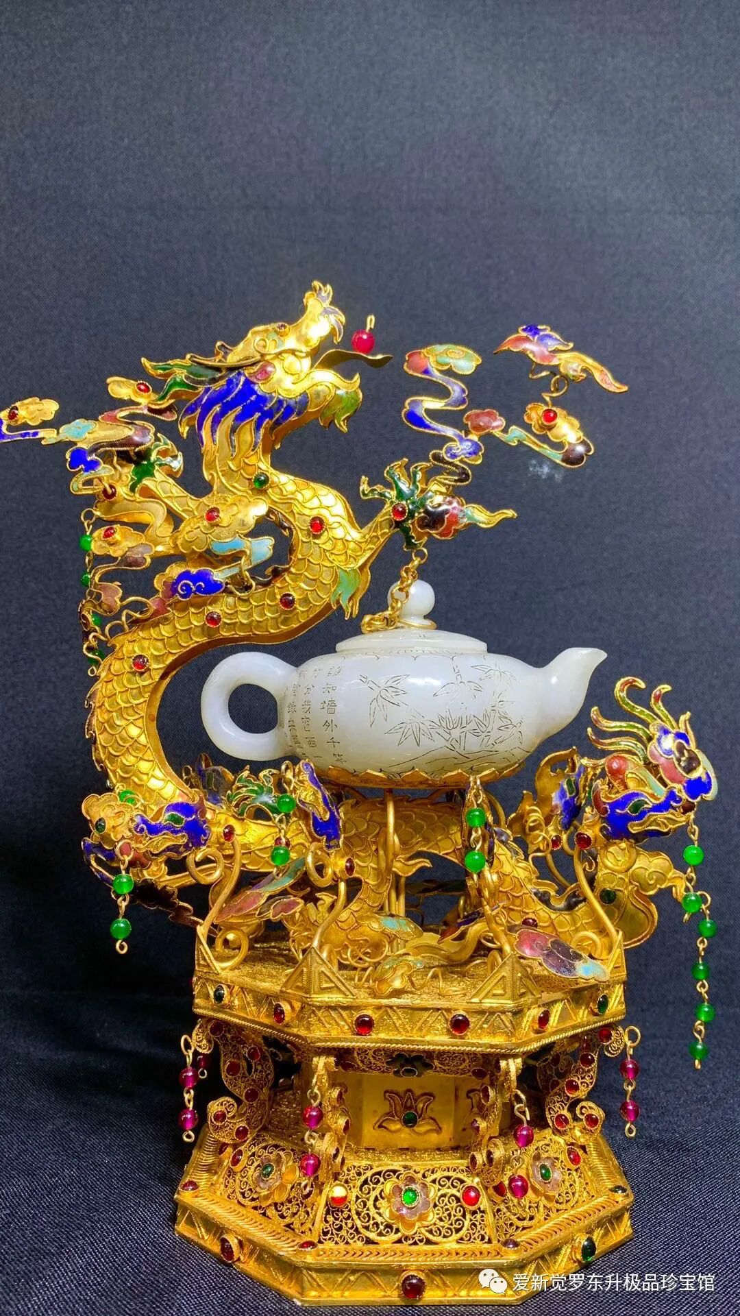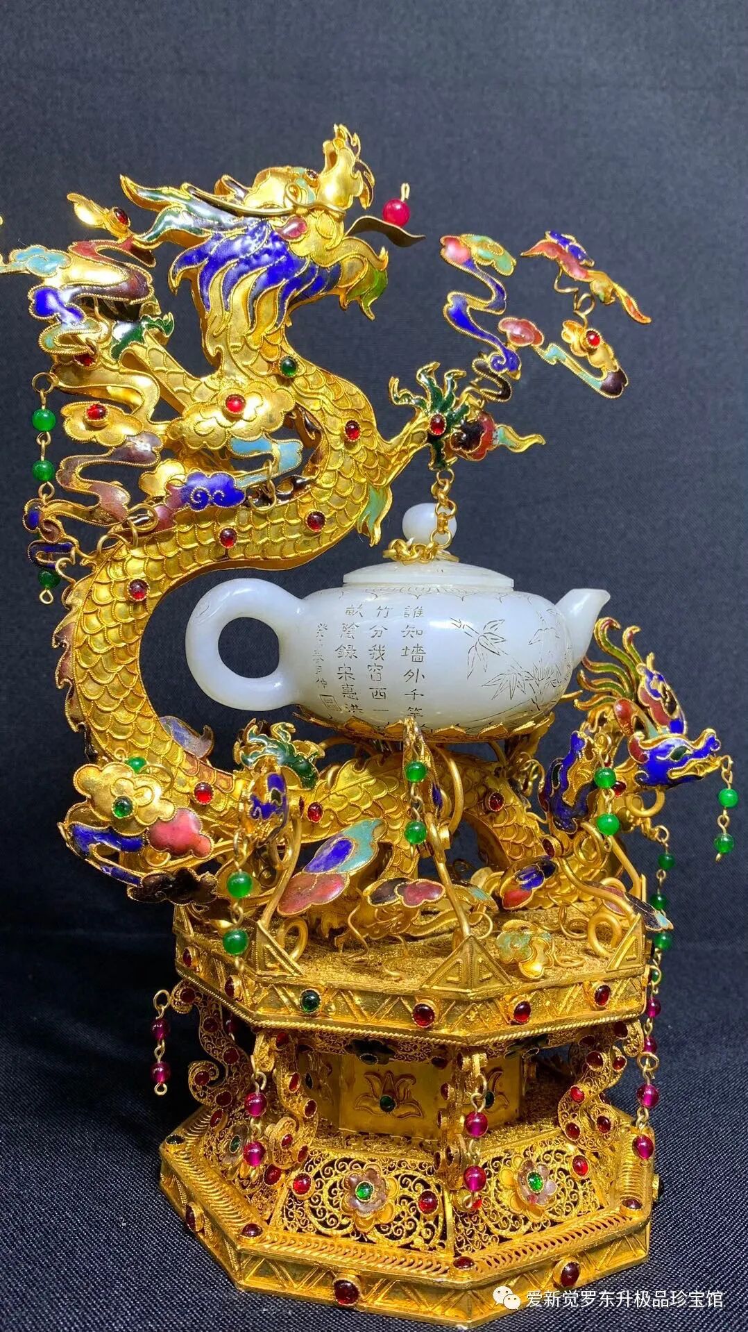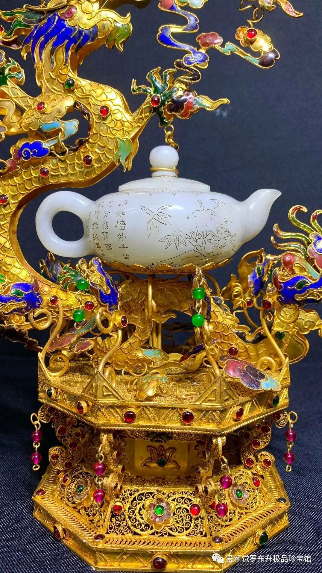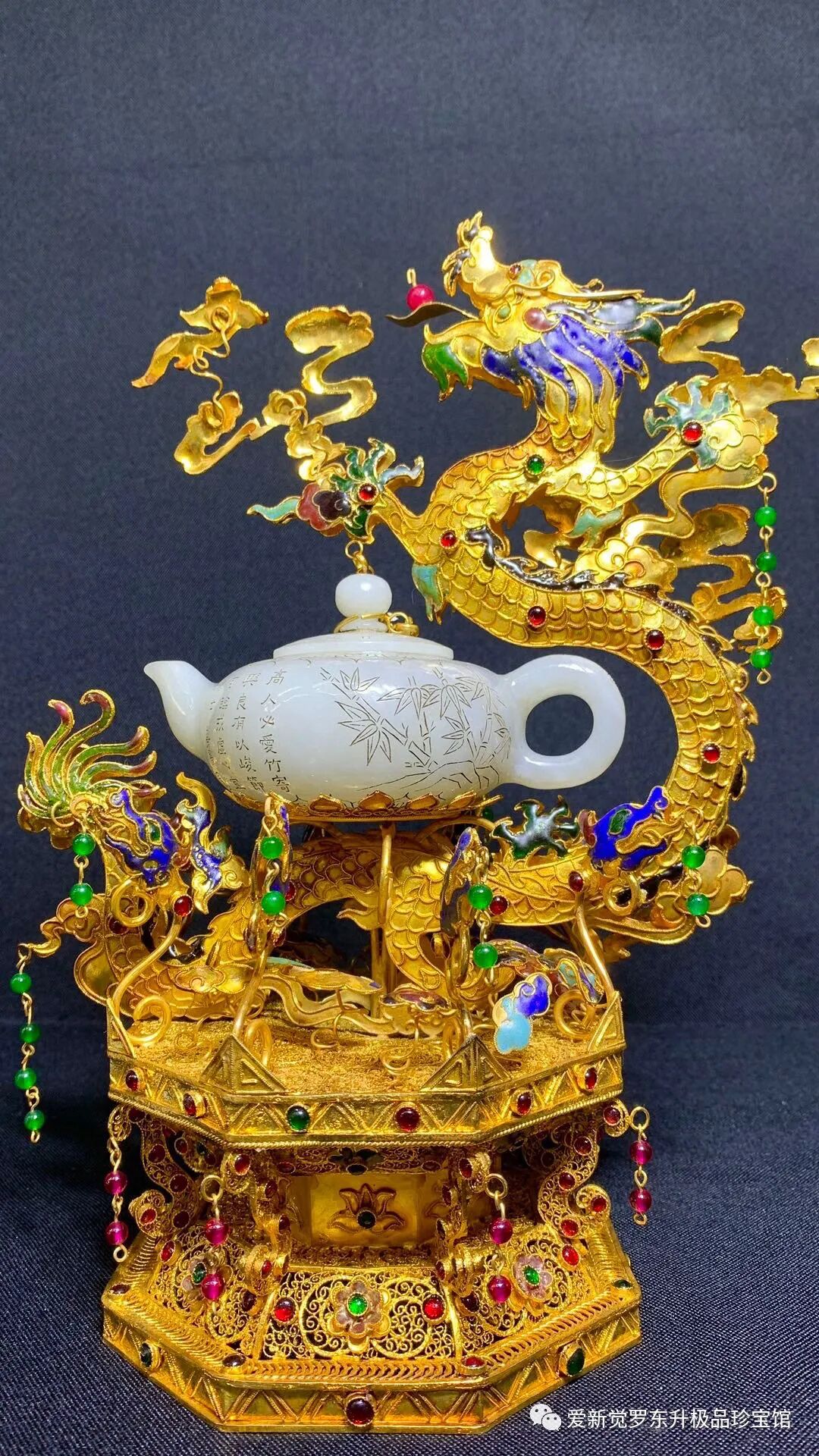 此外,艺术品成为合法动产也意味着藏品的变现变得更加容易。过去,由于艺术品的流通受到限制,很多藏家很难将手中的艺术品变现。但现在,随着市场的开放和流动性的提高,藏家们可以更加容易地找到买家并将艺术品变现。这为藏家们提供了一种新的收入来源,也为投资者提供了一种新的投资方式。鎏金累丝镶嵌和田玉【茶壶】高33cm 宽25cm重3斤可国检
