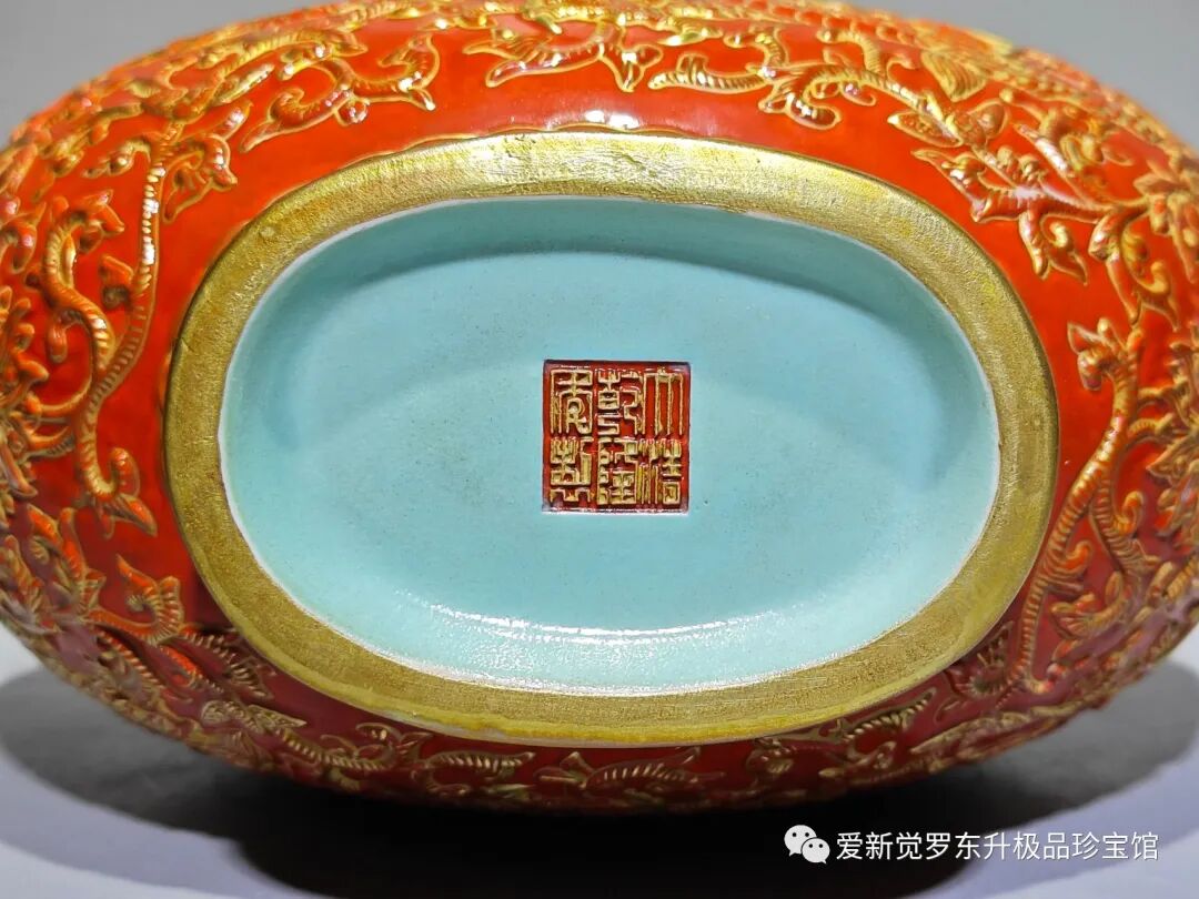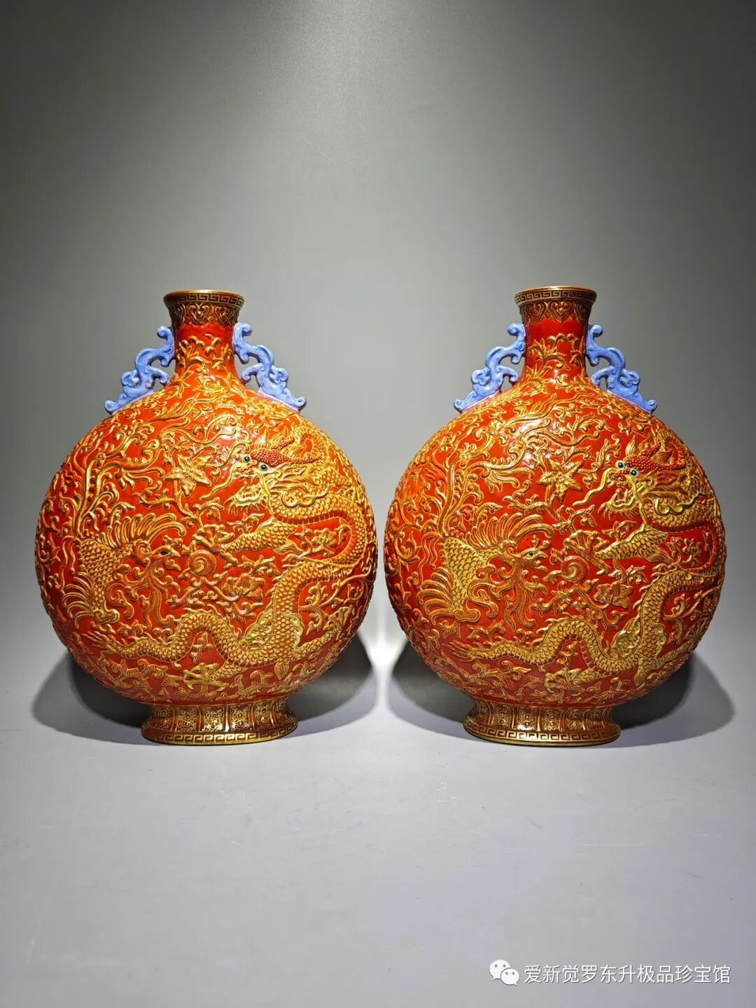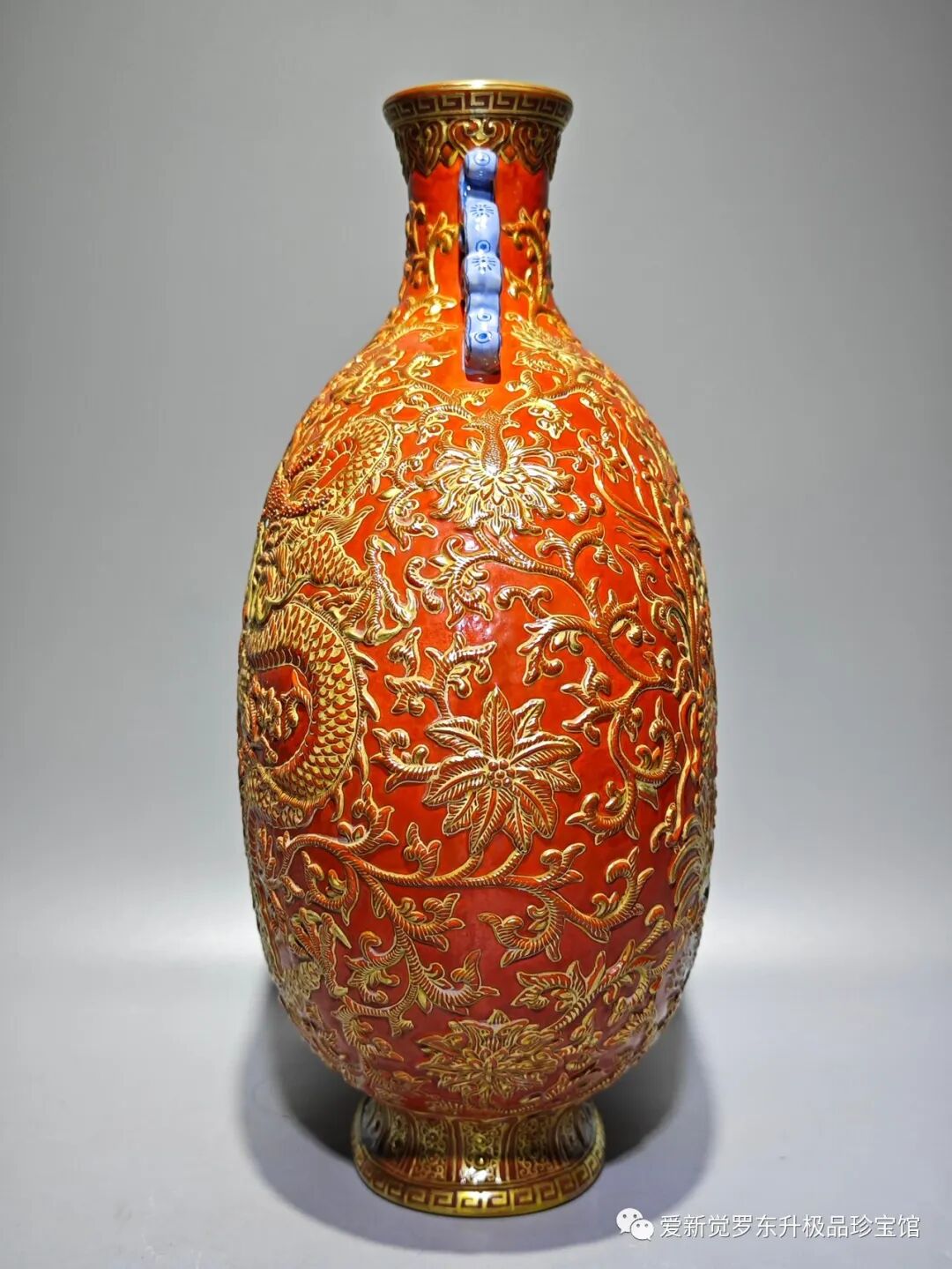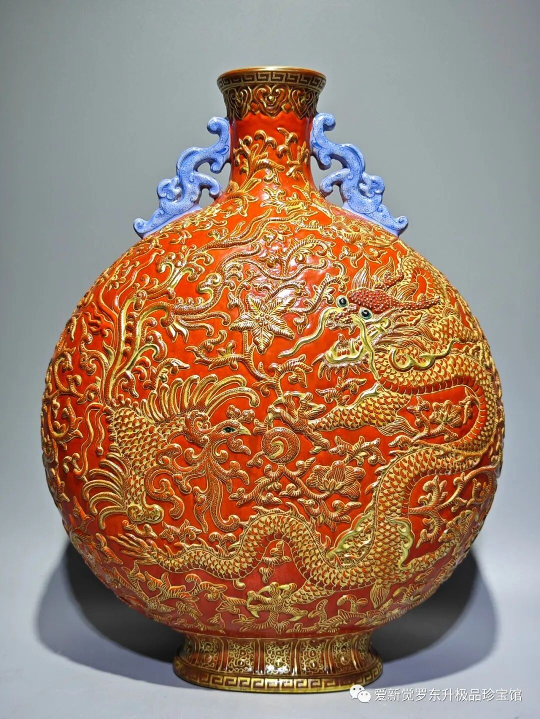 大清乾隆年制,珊瑚红浮雕缠枝莲龙凤呈祥描金抱月瓶,高:32cm,宽:25cm