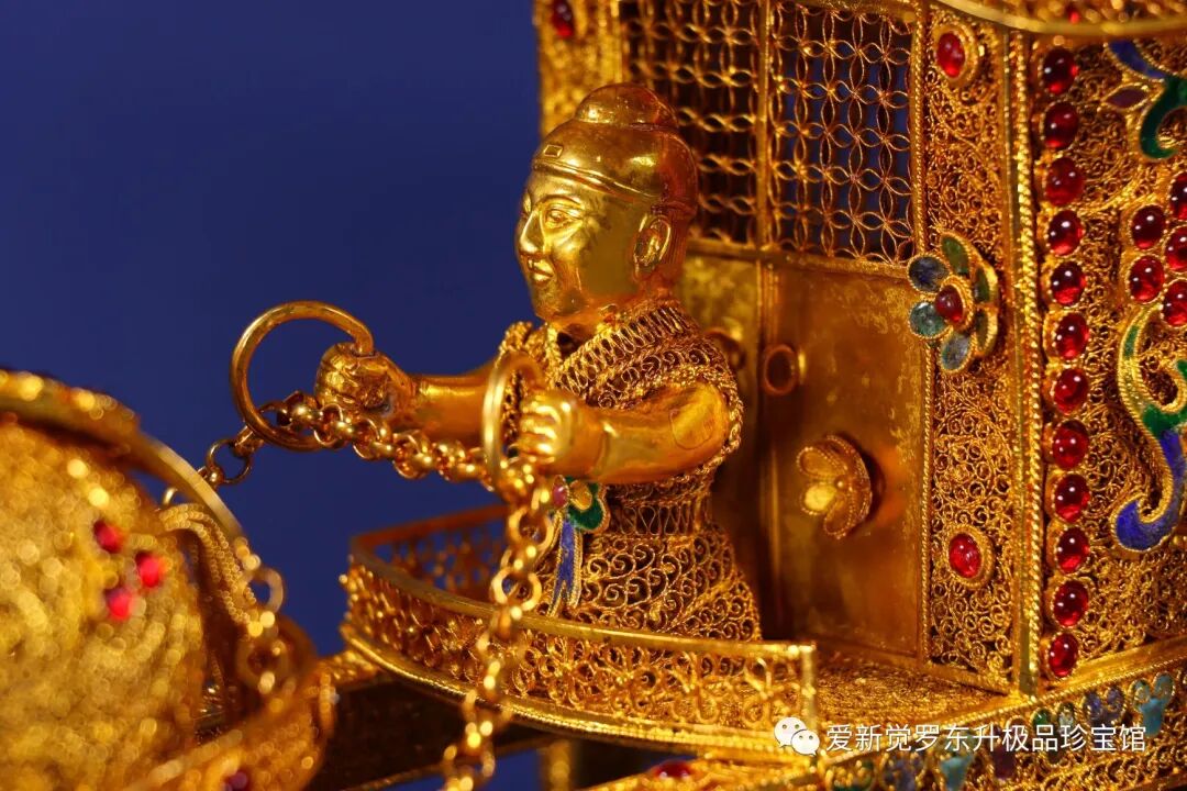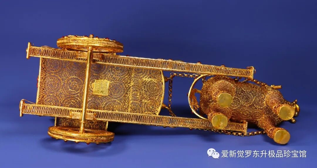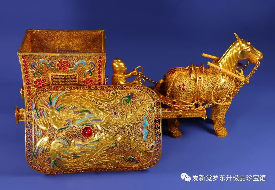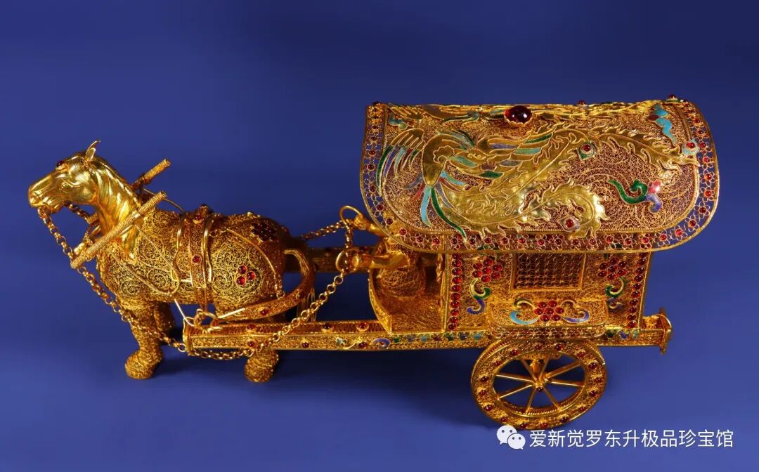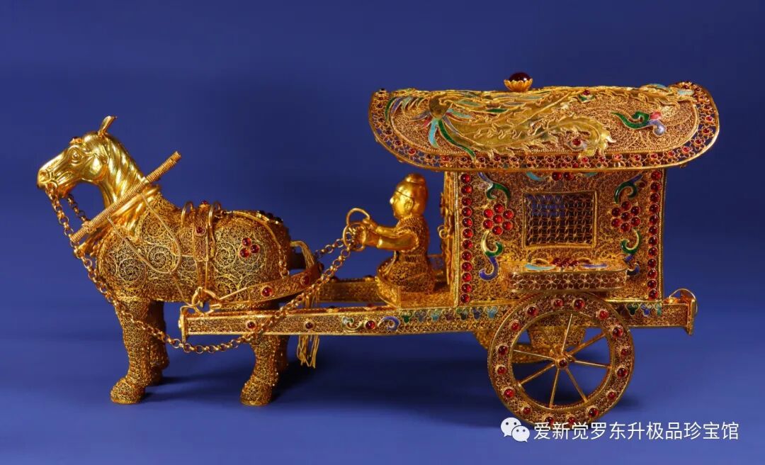 旧藏精品纯手工打造掐丝鎏金镶宝石马拉车一套高20厘米,长42厘米,宽13厘米,重1810克
